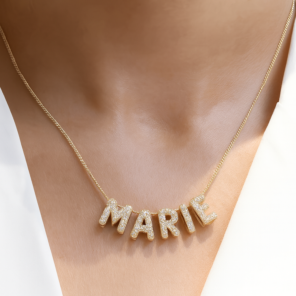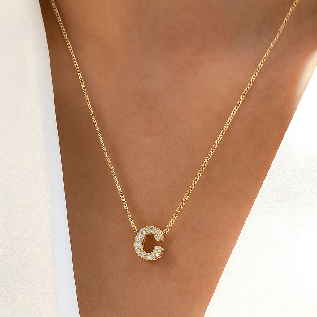 Each piece is strung on a sleek, feminine chain and finished with beautifully detailed, diamond-inspired pavé letters that make your name or word feel truly special.