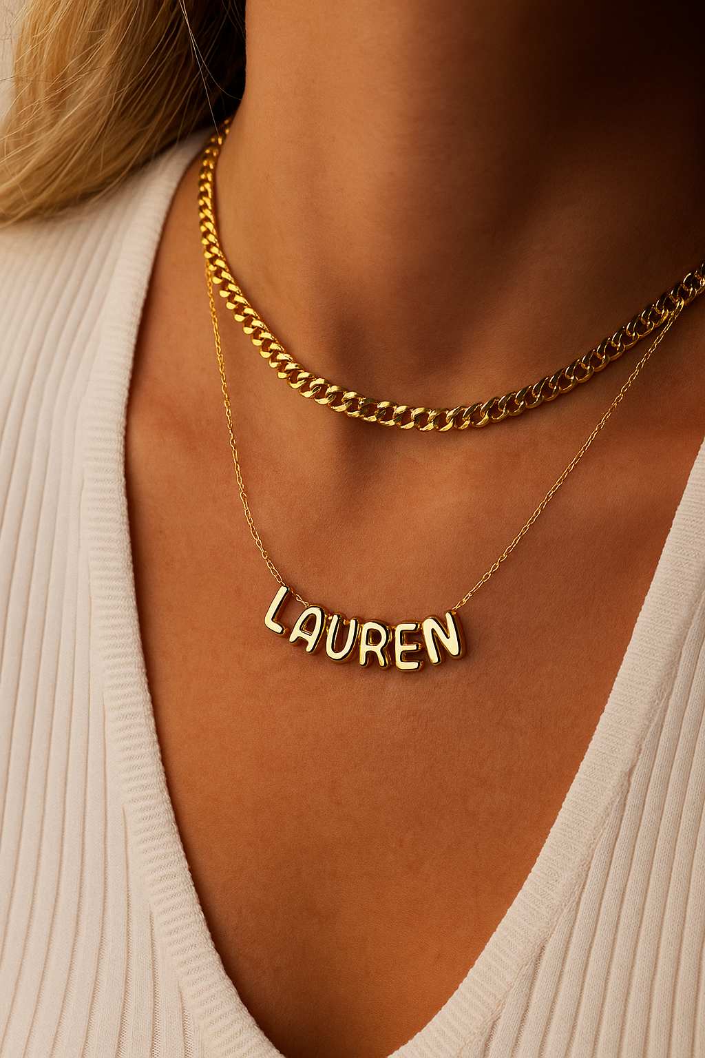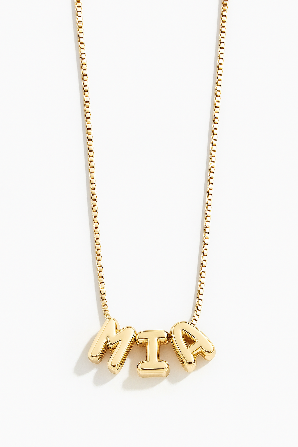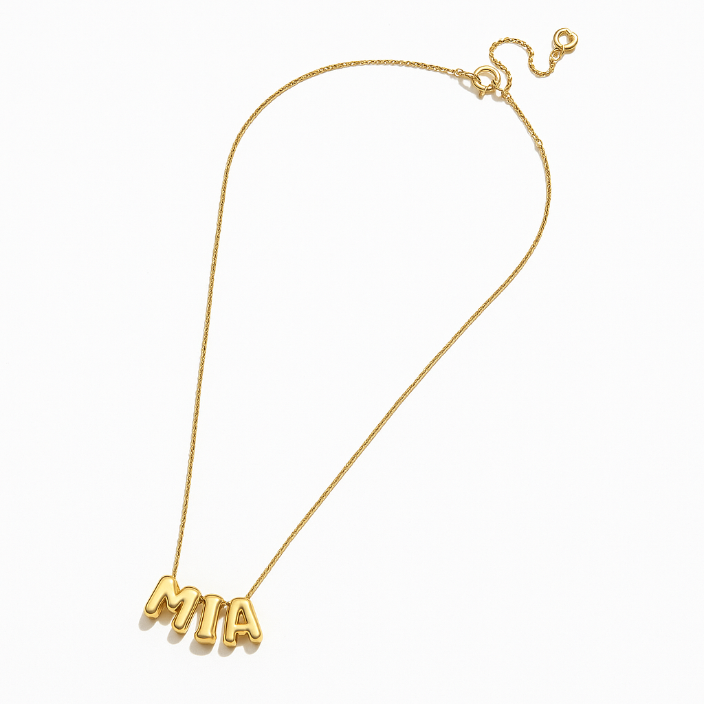 It’s the timeless nameplate—reimagined with a modern twist. Bold, bubble-style letters bring a fun, whimsical vibe, while a sleek box chain keeps the look effortlessly chic.